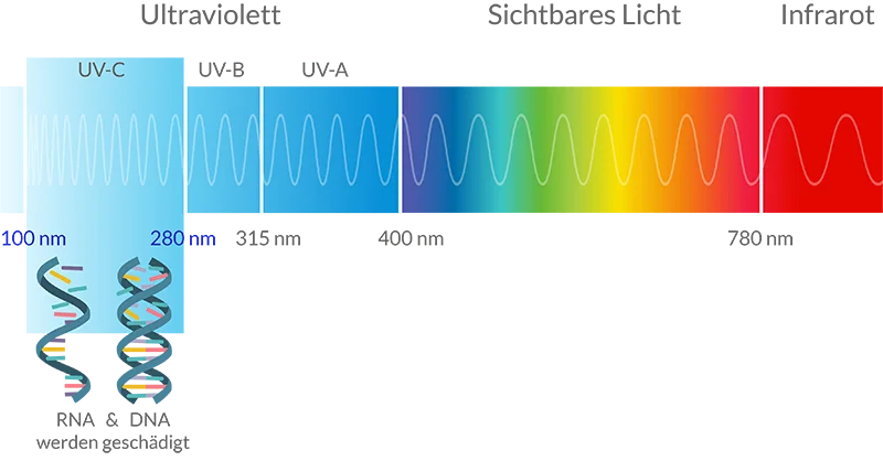 UV-C-Licht ist extrem energiereich und kann die genetische Struktur von Keimen verändern. Es zerstört die DNA und RNA von Viren, Bakterien und Pilzen – die Erreger können sich nicht mehr vermehren und sterben ab.